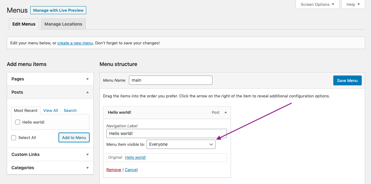 With Restrict installed on your website, each menu item will have Menu available to dropdown from which you will be able to select one of the following criteria:
